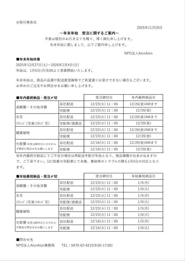 AlonAlon年末年始休暇に伴う受注停止期間のご案内