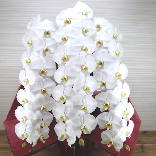 大輪胡蝶蘭の定番と言える当店最上級の胡蝶蘭です。豪華さと気品とインパクトがあり、どこにお届けしても至上の贈り物として存在感を持ち続けます。純白の花弁の優美な姿は、開店祝いや開業祝いなどの慶事にピッタリのビジネスギフトです。